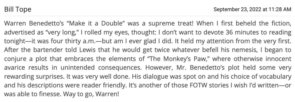 Another day, another reprint of Make It a Double is live. I’ve been very fortunate to have this novelette reprinted three times in the last few months. This time, it appears on Fiction on the Web, a popular destination for short fiction for over 25 years. And at least one reader (who is definitely not me) seemed to like it, already posting an awesome review: