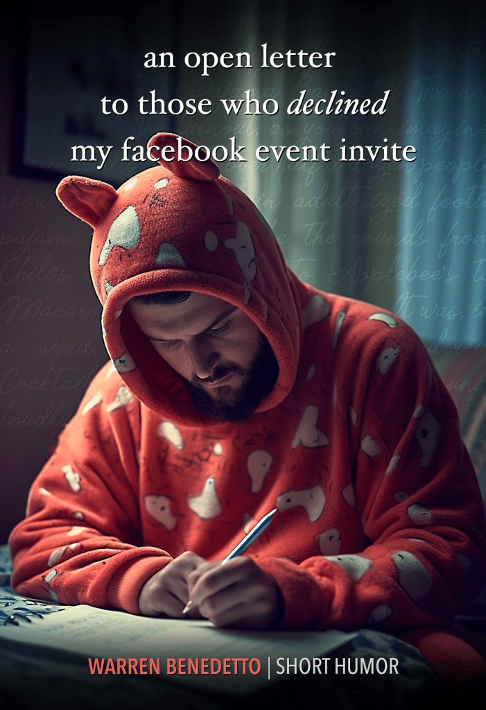 My short humor piece An Open Letter To Those Who Declined My Facebook Event Invite has been published by The Weekly Humorist. It’s a heartfelt letter to those who felt they had something better to do than attend my Game of Thrones Footie Pajama Bar Crawl. You know who you are.